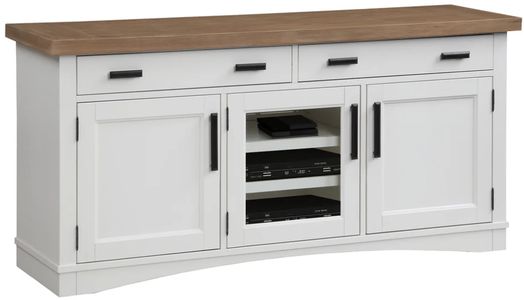 Give your living area an instant refresh with the addition of the Americana Modern 63-inch tv console with power center. A tastefully designed media option, it features closed storage, glass doors for media components, and a fresh cotton white finish accented with a contrasting wood-grain top and metal hardware.Read More