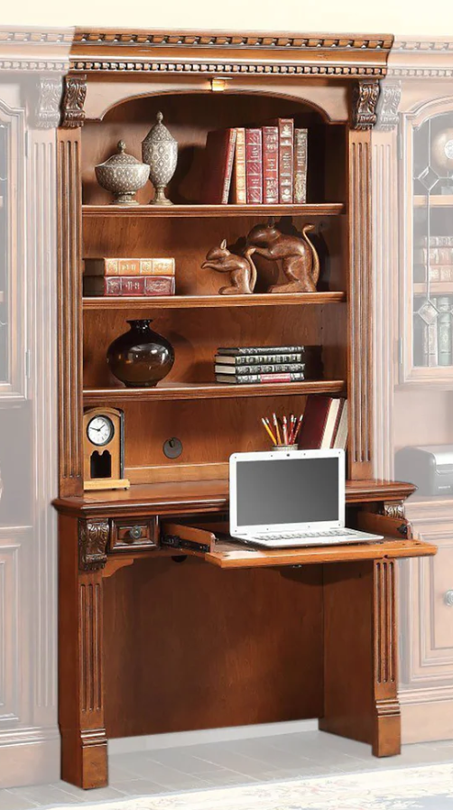 Add a stunning focal point to your room and create a functional workspace with this two-piece Library Desk and Hutch. A signature piece in the Huntington collection, it features energy-efficient LED lighting, adjustable wood shelves, and a center drop-down drawer for a keyboard. A rich Antique Vintage Pecan finish highlights its carved detailing.